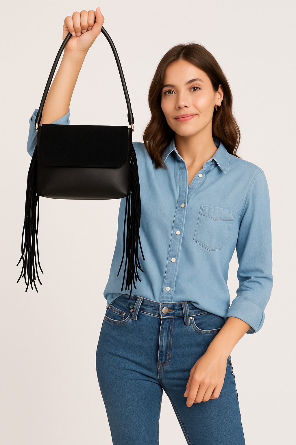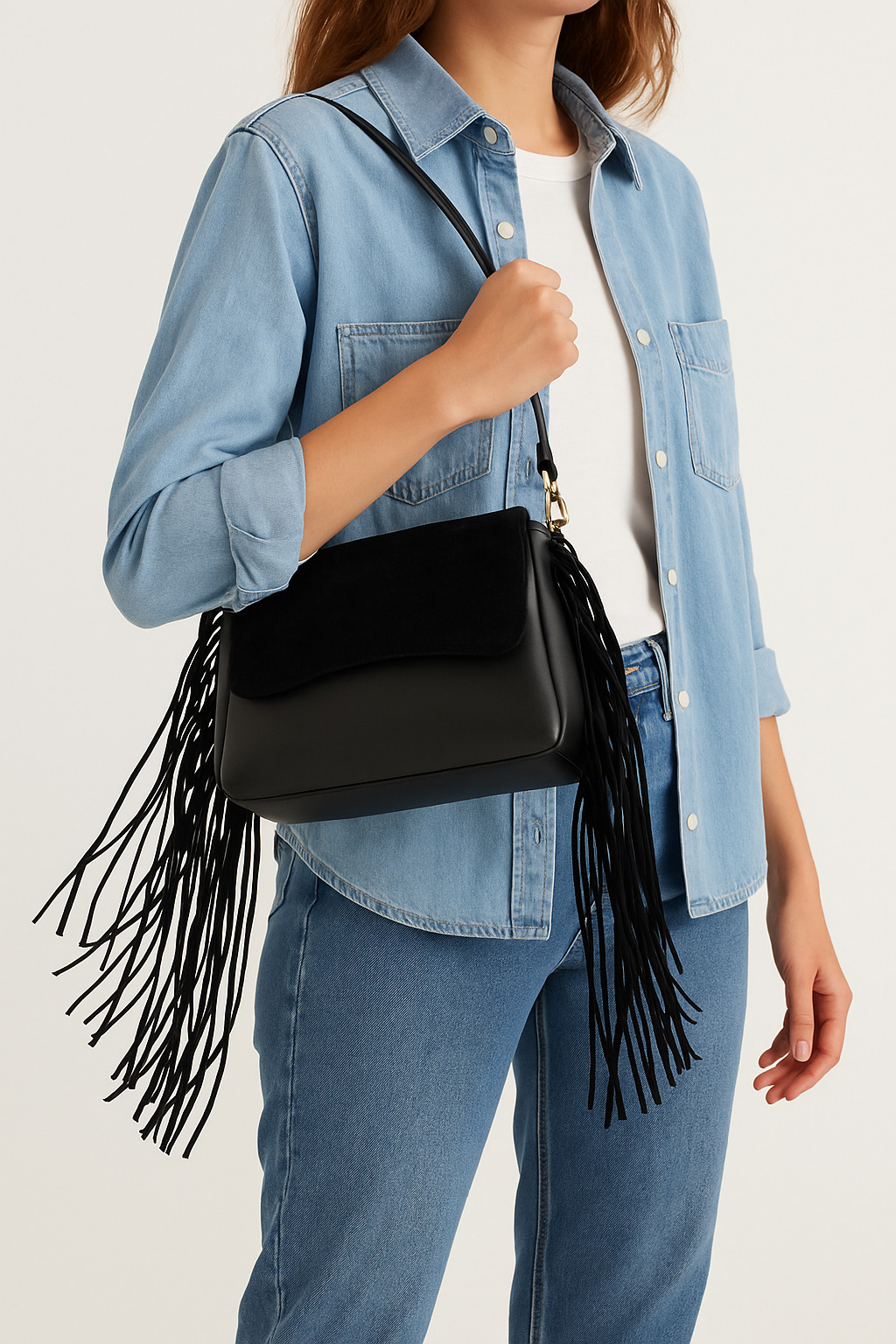 Zarafet ve bohem tarzı bir araya getiren bu siyah püsküllü çanta, hem günlük kullanıma hem de özel günlerde şık kombinlerinize eşlik edecek şekilde tasarlandı. Yumuşak dokulu deri görünümlü dış yüzeyi, ön kapağındaki süet detayla birleşerek modern bir duruş sergiler. Uzun püskül aksesuarları ile hareketli ve özgün bir stil sunar.